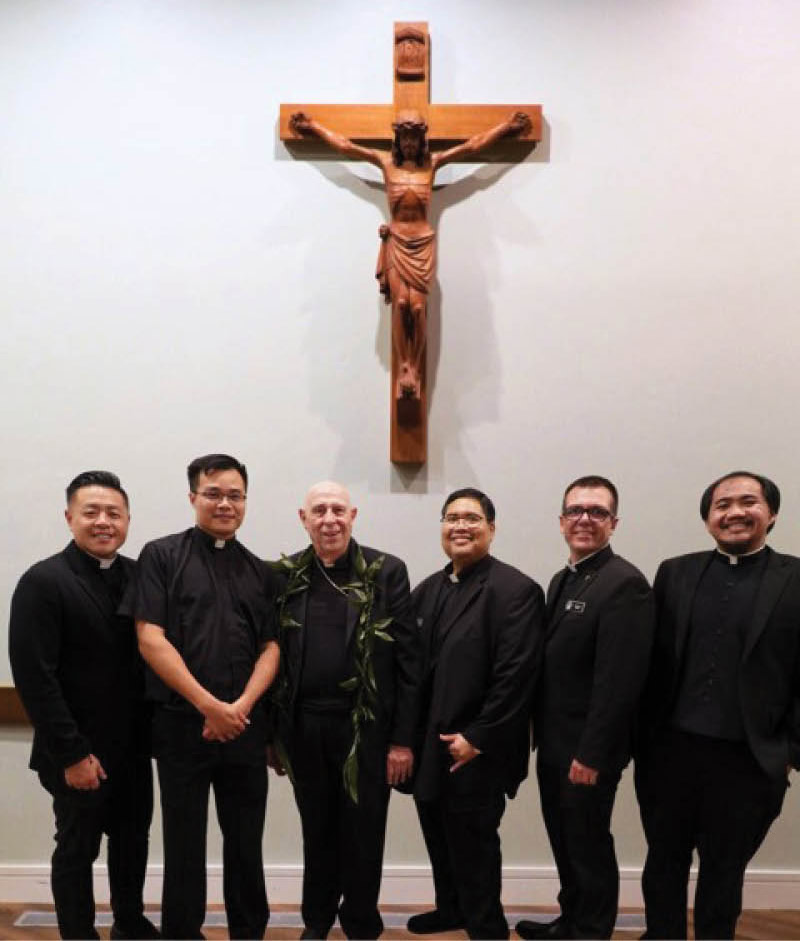 Students from St. Patrick’s Seminary and University gather to honor Bishop Larry Silva at an annual Priest Day event. From left: seminarian Anthony Tran, Deacon Hai “Francis” Pham, Bishop Silva, Deacon Kurt Meyer, seminarian Larry Denis III and seminarian Edgar Allen Pobre. (Courtesy Deacon Hai “Francis” Pham / 2023)