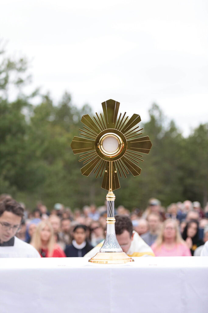 The Eucharist was displayed for pilgrims’ veneration by Bishop Andrew H. Cozzens of Crookston, Minnesota, on May 19 along the procession to the headwaters of the Mississippi River for the launch of the Marian Route of the National Eucharistic Pilgrimage. (Courtney Meyer / OSV News)