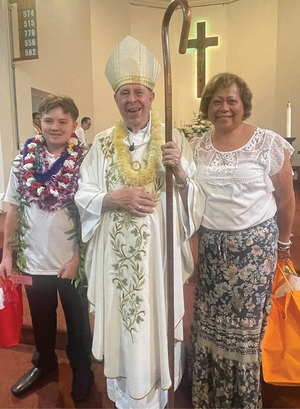 Isaia Edmonds Wong, left, and his grandmother Yvonne Wong stood with Bishop Larry Silva April 13 after Isaia received the first Communion and confirmation sacraments at Holy Rosary Church in Keaau. (Courtesy Linda Villena)