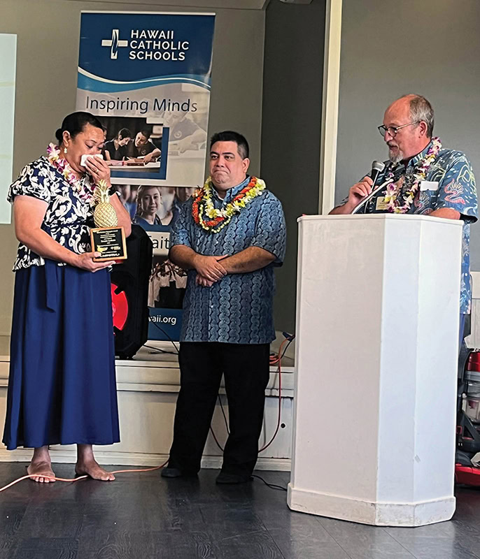Sacred Hearts School Principal Tonata Lolesio was overcome with emotion May 23 as she was awarded the Golden Pine’apple’ award recognizing the state’s top Catholic school administrator. Hawaii Catholic Schools Superintendent Llewellyn Young, center, and Dale Fryxell, dean of the School of Education and Behavioral Sciences at Chaminade University of Honolulu, announced the award. Chaminade is a sponsor of the annual recognition. (Celia K. Downes / Hawaii Catholic Herald)