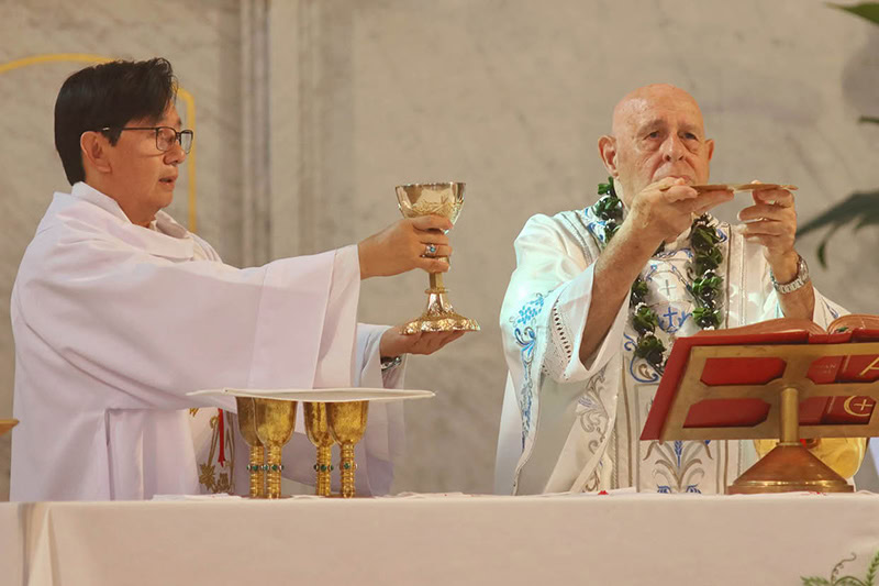 Deacon Jonathan Lam assisted Bishop Larry Silva in the Eucharistic prayer during Mass at the Co-Cathedral of St. Theresa in Honolulu June 8 as Oahu also held events as part of the isles’ Eucharistic Congress celebration. (Courtesy Dann Ebina)