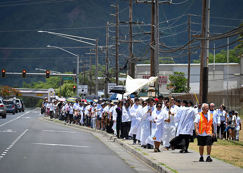 Above: Participants in Maui’s Eucharistic procession walked in front of Baldwin High School in Wailuku as they headed from St. Anthony Church to Christ the King Church in Kahului. (Courtesy Glenn and Maddie Pascual / St. Anthony Church)