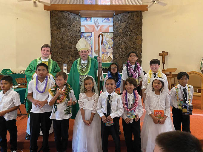 On June 29, in the presence of the faithful of St. Catherine of Alexandria Parish in Kapaa, Bishop Larry Silva conferred upon 11 children in our faith formation program the sacraments of confirmation and first holy Communion. Father Dario Rinaldi concelebrated the Mass, assisted by Deacons Andy Ragasa and Averiet Soto. The masters of ceremony were Ferdinand Pabustan and John Constantino. A big thank you to the catechists, parents and sponsors for preparing and guiding these children on their faith journey and thank you to their families for participating in this grace-filled day.