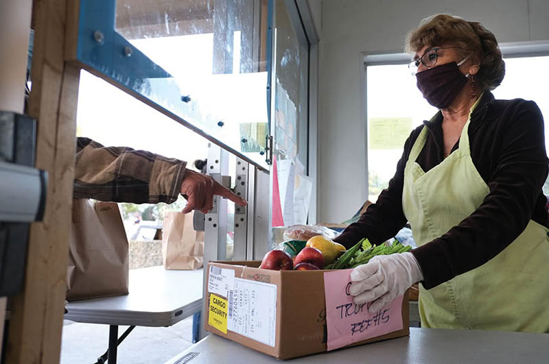 Maryann Arceo, a volunteer at St. Anthony’s Padua Dining Room in Menlo Park, California, listens to a man as he receives a box of free groceries at St. Anthony’s Catholic Church. (David Maung / CNS / 2021)