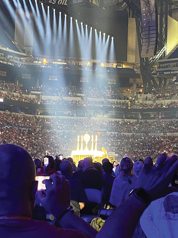 Lucas Oil Stadium in Indianapolis was packed each night of the National Eucharistic Congress as the Eucharist, illuminated by spotlights, was displayed for adoration. (Courtesy Lani Wong)