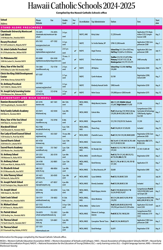 Hawaii Catholic Schools chart: 2024-25 08/14/2024 by Hawaii Catholic Herald Please click here to see a chart of Hawaii’s Catholic schools for the 2024-25 academic year.