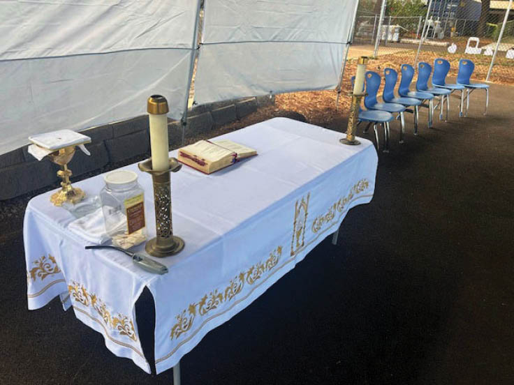 From top: Mass was held beneath tents in the campus’ future outdoor play area; signs welcoming students to the new school year dotted the school grounds; the altar was set up for the commemoration Mass; Christ the King Church held its candlelight service and rosary Aug. 2. (School photos courtesy Hopsing Coon; church photo courtesy Christ the King)