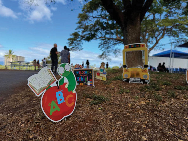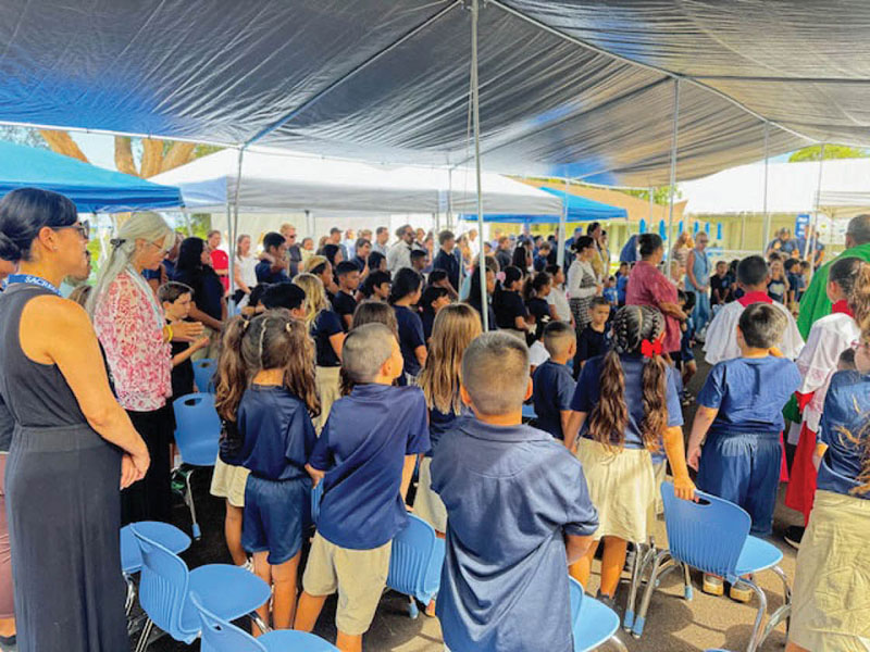At Sacred Hearts School, students gathered on the grounds of their new Kaanapali campus for Mass on Aug. 8, the exact date of the wildfire disaster in Lahaina and Kula. Msgr. Terry Watanabe, vicar forane of the Maui-Lanai Vicariate, presided at the liturgy, which was held in the space that will become the school’s outdoor recreation area.