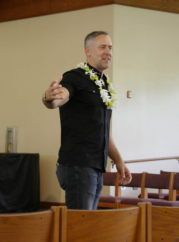 From top: Sacred Hearts School Principal Tonata Lolesio provided an update on how the school has fared in the wake of the Aug. 8, 2023, wildfire that devastated Lahaina. Sacred Hearts Academy teacher Leilani Asuncion-Tagupa was honored with the Ka Hooulu Innovation Award, sponsored by Chaminade University of Honolulu. Author and speaker Chris Stefanick gave a keynote talk after Mass. (Photos by Celia K. Downes / Hawaii Catholic Herald)