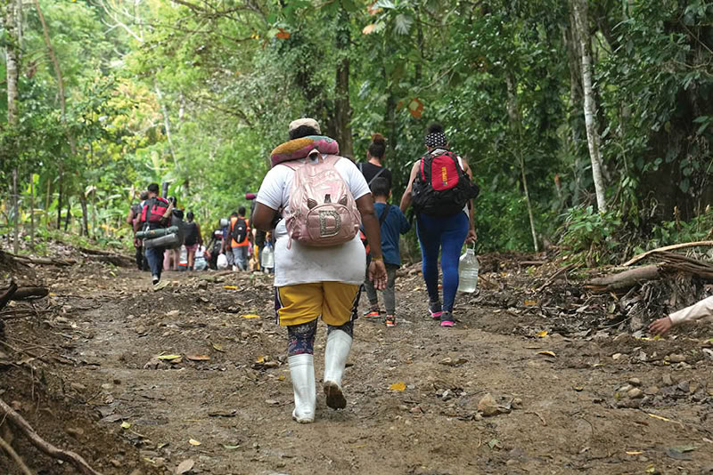 Migrants walk in small groups to protect themselves as they journey through the wild roads of the Darien Gap, with some acting as lookouts while others protect the most vulnerable people. (Manuel Rueda / Global Sisters Report / OSV News)