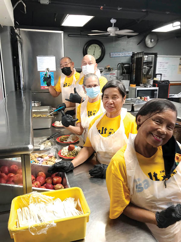 St. John Apostle & Evangelist Church, Mililani, parishioners are back volunteering to serve dinner at the Institute for Human Services men’s shelter every third Wednesday of the month. The Knights of Columbus joined daily Mass servers and IHS staff for a recent meal at the Iwilei shelter. Pictured are parishioners on the service line. (Courtesy St. John Apostle & Evangelist Church)