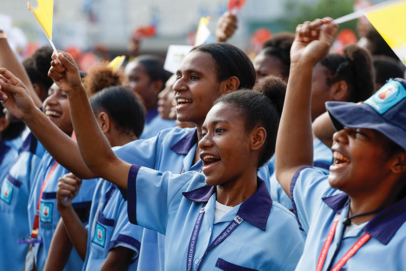 Young adults cheered Sept. 9 as they welcomed Pope Francis to Sir John Guise Stadium in Port Moresby, Papua New Guinea. (Lola Gomez / CNS)