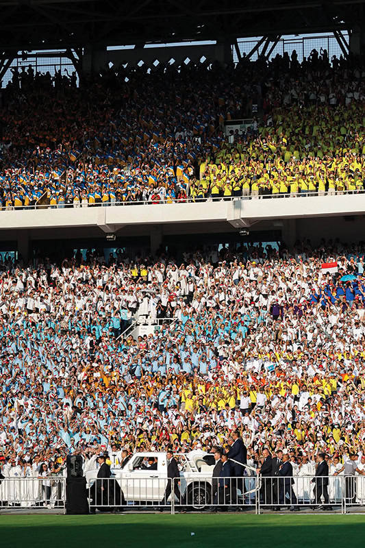People cheered Sept. 5 as Pope Francis arrived in the popemobile at Gelora Bung Karno Stadium in Jakarta, Indonesia, to celebrate Mass. (Lola Gomez / CNS)