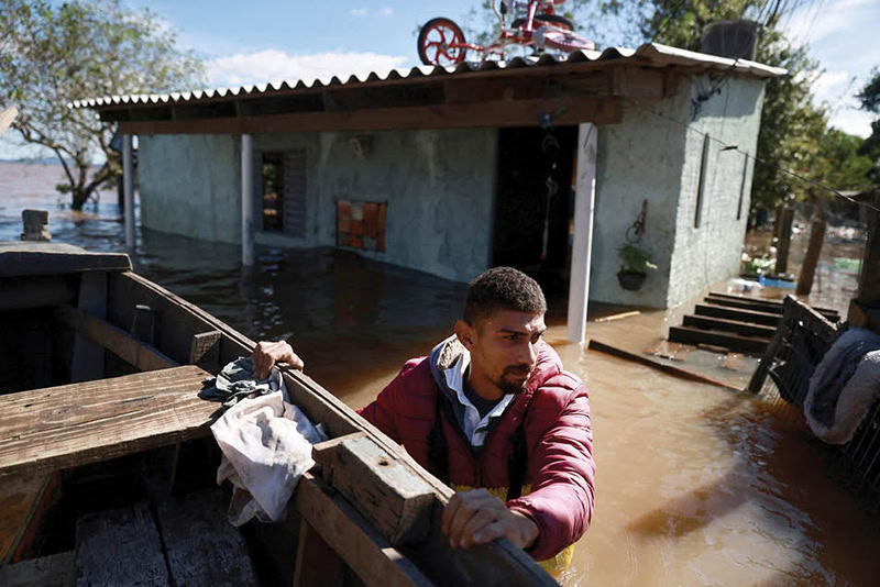 Valderci Trindade, 24, who lost his house, tried to save useful items May 14 in an area flooded by heavy rains in the Serraria neighborhood of Porto Alegr in Brazil’s Rio Grande do Sul state. (Diego Vara / Reuters / OSV News)
