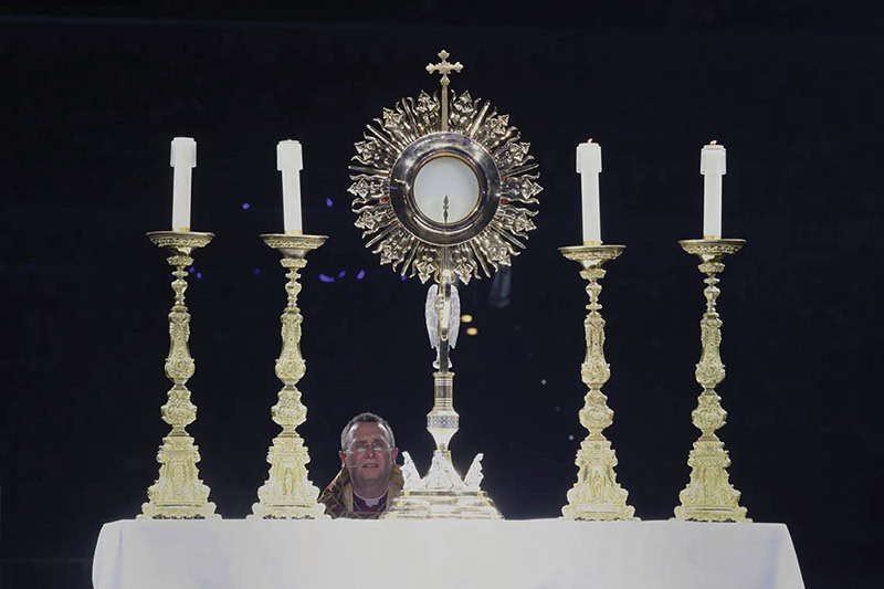 Bishop Andrew H. Cozzens of Crookston, Minnesota, chairman of the board of the National Eucharistic Congress Inc., kneels in prayer before the monstrance during Eucharistic adoration at the opening revival night of the 10th National Eucharistic Congress at Lucas Oil Stadium in Indianapolis. (Bob Roller / OSV News / July 17)