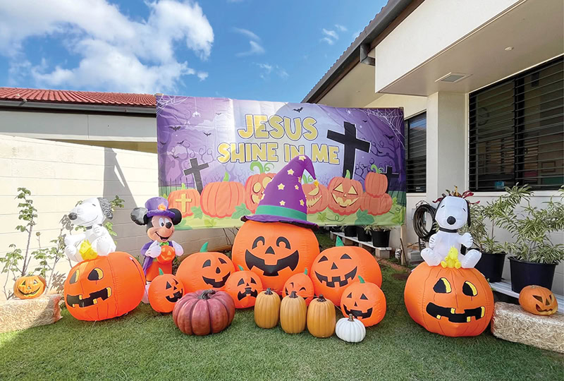 Halloween displays don’t have to be spooky. Outside Rosary Preschool in Waipio, pumpkins and cartoon characters reflect a hap-pier message. (Celia K. Downes / Hawaii Catholic Herald)