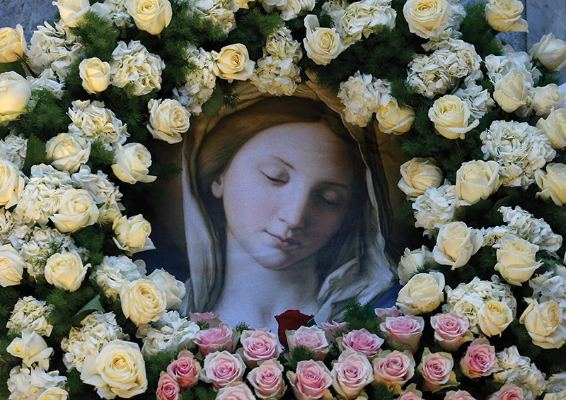 Flowers surrounded an image of Mary at the base of a tall Marian statue overlooking the Spanish Steps in Rome on Dec. 8, 2021, the solemnity of the Immaculate Conception. Per tradition, Pope Francis prayed at the statue before daybreak. (Paul Haring / CNS)