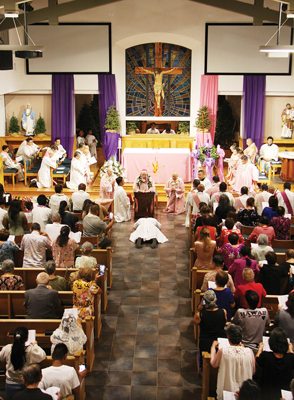 Preston Castro lay prostrate as the Litany of Saints was recited during his ordination Mass Dec. 14 at St. Joseph Church in Waipahu. (Celia K. Downes / Hawaii Catholic Herald)