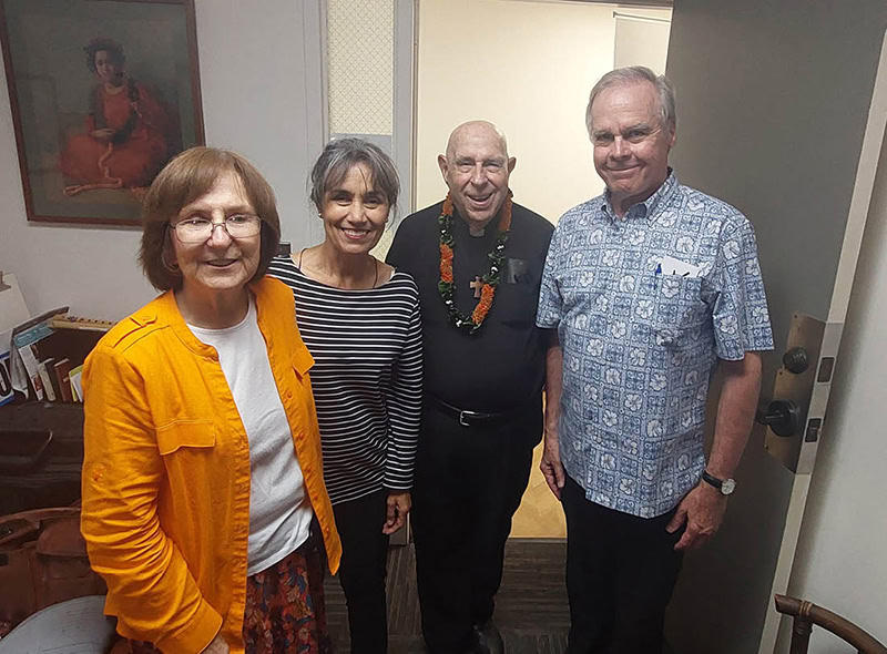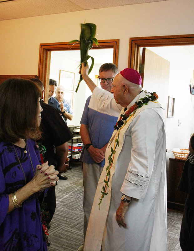 The Pearson Place Pregnancy Resource Center celebrated its relocation to the Liliha Professional Building with an open house and blessing Dec. 7 by Bishop Larry Silva. The center was previously situated above the Daughters of St. Paul bookstore in downtown Honolulu. Its new office includes a reception area, two meeting rooms and a break room that is envisioned as a possible ultrasound room. Above, Bishop Silva blessed the office with holy water. Below, Bishop Silva joined current and former Pearson Place leaders for a photo: Vice President Mary Smart, left; former President Susan Duffy, second from left; and President Fred Hagen. (Photos by Celia K. Downes / Hawaii Catholic Herald)