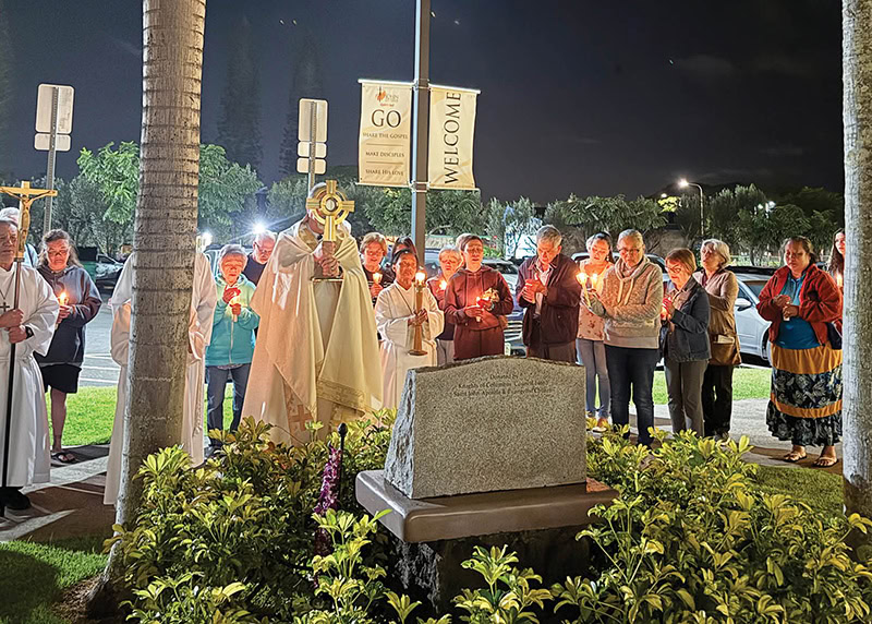 As part of their weekly Encounter night, parishioners at St. John Apostle and Evangelist Church in Mililani led a candlelight procession Jan. 22 from the church’s courtyard to its Memorial of the Unborn, then held a prayer vigil. A statement on the 52nd anniversary of the Supreme Court’s Roe v. Wade decision by Toledo, Ohio, Bishop Daniel E. Thomas, chairman of the U.S. Conference of Catholic Bishops’ Committee on Pro-Life Activities, was read during adoration, as was a litany of the Blessed Virgin Mary. (Courtesy photo)