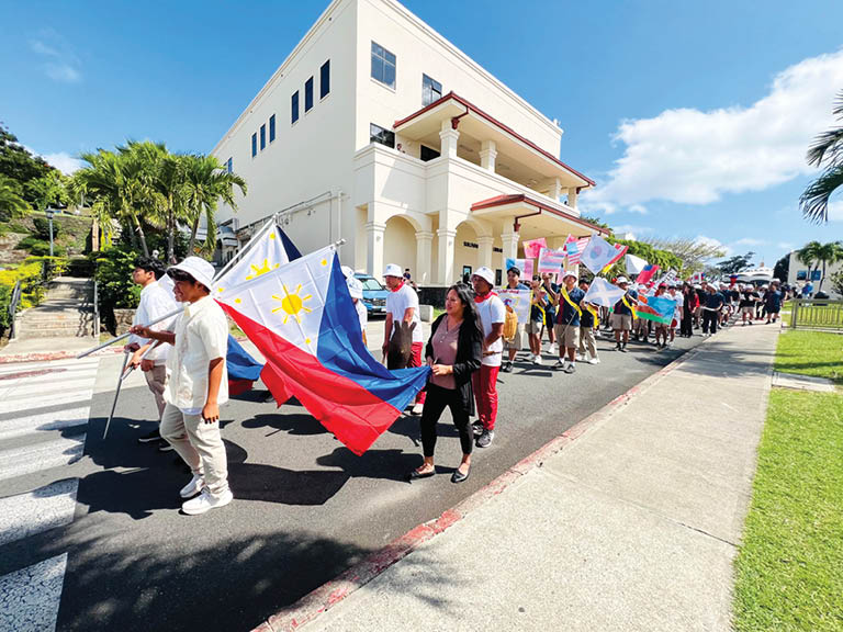 Saint Louis School, Chaminade University of Honolulu, Sacred Hearts Academy and the Marianist Center of Hawaii came together Feb. 7 to mark the 100th anniversary of the Palolo Stream Bridge, which Marianist Brother Dennis Schmitz of the Marianist Center called a powerful connection between the world and Kalaepohaku, the hill that both Chaminade and Saint Louis School call home. The event included performances, a parade and speakers on the campuses’ Front Lawn; participants also walked to the bridge linking Waialae Avenue and Kalaepohaku. According to a press release from Saint Louis School, Hawaiian Contracting Co. built the bridge that passes over Palolo Stream in 1925 for $14,500. Above, Saint Louis School students bearing flags from across the globe marched in the parade. (Courtesy Nada Ashrafi / Saint Louis School president’s office)