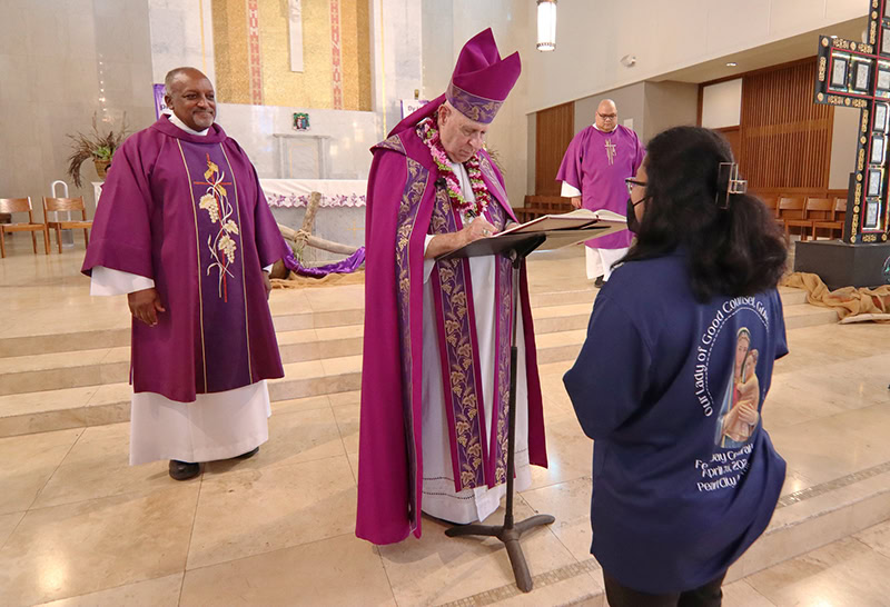Bishop Larry Silva signed the book of the elect for Our Lady of Good Counsel Church at the Co-Cathedral of St. Theresa on March 9 during the rite of election for Oahu vicariates as Deacon Ray Lamb of the co-cathedral looked on. (Courtesy Dann Ebina)