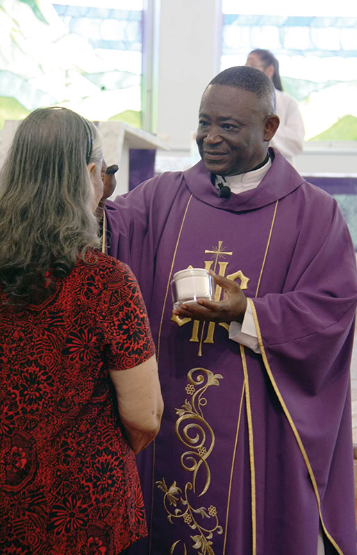Father Clement Beeri, parochial vicar of St. Elizabeth Church in Aiea, distributed ashes March 5 during the noon Ash Wednesday Mass. (Celia K. Downes / Hawaii Catholic Herald)