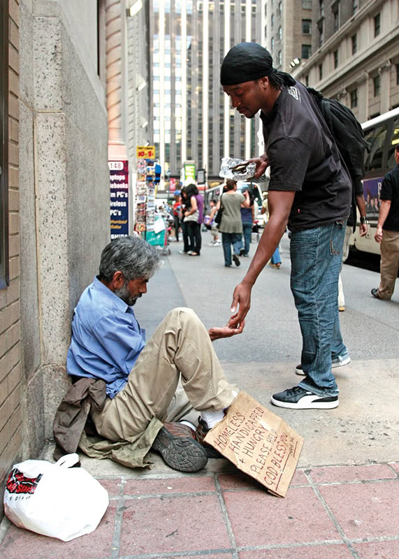 A pedestrian gives money to a homeless man sitting outside St. Francis of Assisi Church in New York City. Almsgiving — donating money or goods to the poor and performing other acts of charity — is one of the three pillars of Lent, along with prayer and fasting, but some say it gets the least attention. (Gregory A. Shemitz / OSV News)