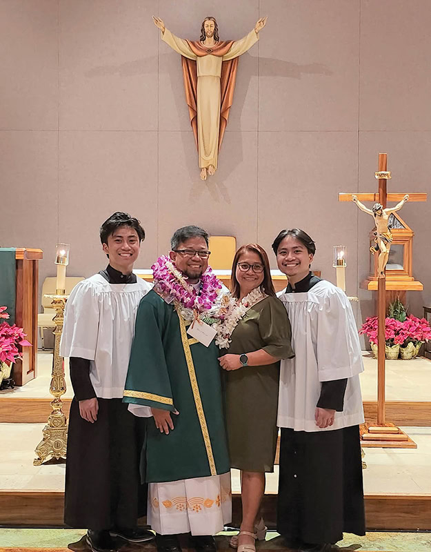 Little did I know that God sent Maggie to be my wife — one of the pivotal moments in my life — providing a strong foundation for my diaconal journey. We got married and were blessed with two wonderful sons, Sealthiel Miggy and Uriel Mauwie (the first of their first names are two of the seven archangels). We made sure our sons grew up active in the faith, with Maggie and the boys involved as sacristans and altar servers in our parish, Resurrection of the Lord Church in Waipio.