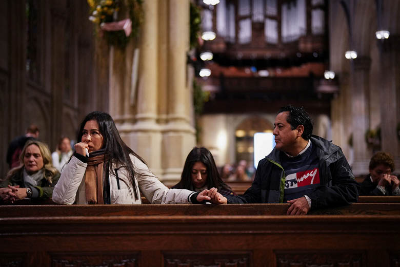 People held hands as they prayed April 21 at St. Patrick’s Cathedral in New York City after Pope Francis’ death was announced. (Adam Gray / Reuters / OSV News)