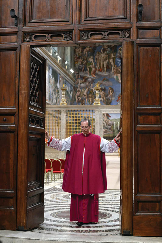 Msgr. Guido Marini, master of papal liturgical ceremonies, closes the doors to the Vatican’s Sistine Chapel on March 12, 2013, as cardinals begin the conclave to elect a successor to Pope Benedict XVI. (CNS file photo)