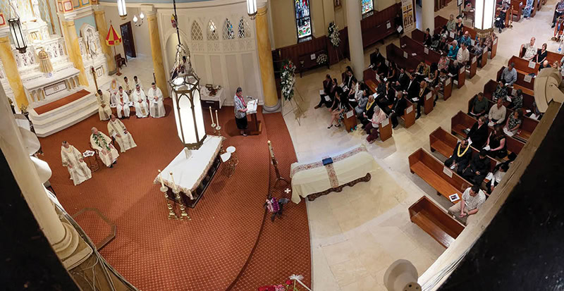 The funeral Mass for Charles Chelliah took place at the Cathedral Basilica of Our Lady of Peace. Msgr. Gary Secor was the main celebrant, with other clergy also participating. (Courtesy Miguel Heraclio)