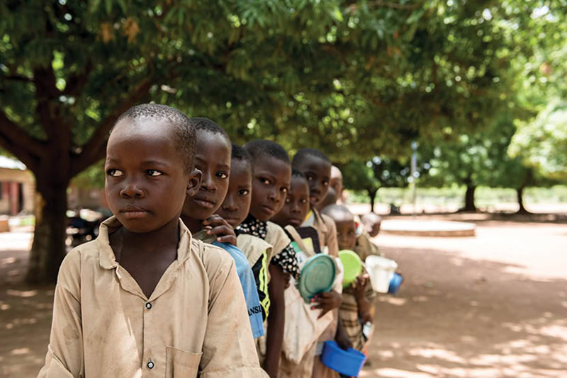 Students at a school in Kandi, Benin, line up as parent volunteers prepare and serve meals under a Catholic Relief Services program called Food for Education, which is supported by the McGovern-Dole International Food for Education and Child Nutrition Program. (File photo / Michael Stulman / Catholic Relief Services / OSV News)