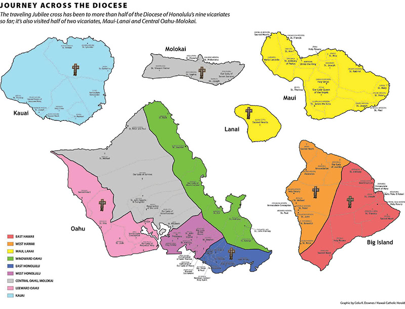 The so-called traveling Jubilee cross has racked up the miles since January, appearing in more than half of the state’s nine vicariates. Vicariates that span more than one island, such as Maui-Lanai and Central Oahu-Molokai, have been split up, with the smaller islands experiencing the cross first.