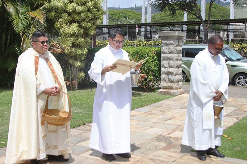 John Jacob Akau stands between Father EJ Resinto, left, and Father Lazarus Anondee outside Sacred Heart Church in Honolulu as they bless animals in honor of St. Francis of Assisi. Akau spent a year at Sacred Heart as part of his formation. (Courtesy John Jacob Akau)