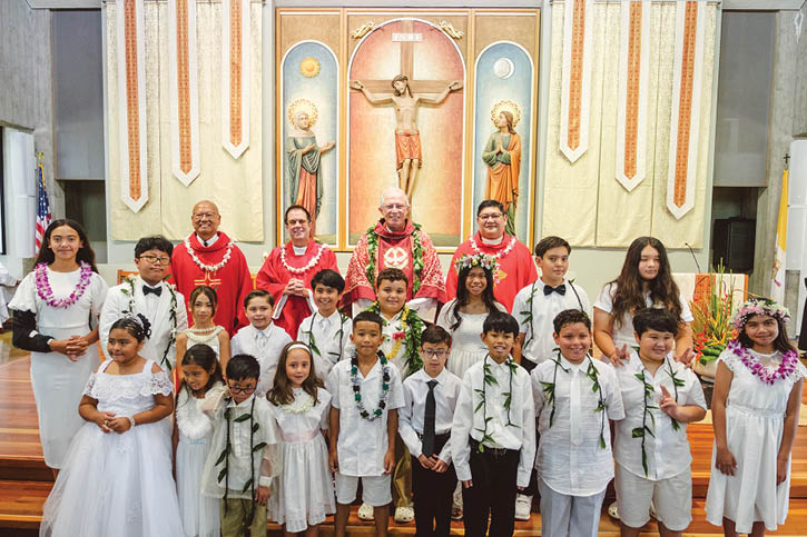 On June 7, students in the first holy Communion and confirmation class at St. John Apostle and Evangelist Church in Mililani received their sacraments. Mahalo to Msgr. Gary Secor, Father Anthony Rapozo, Father Cipriano “Jojo” Alnas and Deacon Romeo Ganibe, as well as all our catechists and families at St John. (Courtesy Bien Pangan)