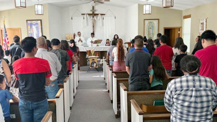 The relics were placed in front of the altar in Blessed Stanley Rother Church in Decatur, Arkansas, as Mass was celebrated. Parishioners also stayed afterward to venerate the relics. (Courtesy Mark Jechura)