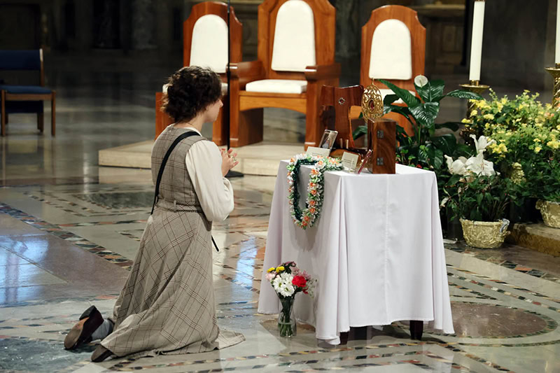 A woman kneeled before the relics of St. Damien and St. Marianne and a fragment of St. Damien’s tree June 15 at the Basilica of the National Shrine of the Immaculate Conception in Washington, D.C. (Timothy Dias / Basilica of the National Shrine of the Immaculate Conception)