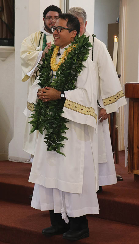 Hearty cheers rose from the pews as the rite of ordination came to an end, with Deacon Akau — draped in maile lei bestowed by his family — acknowledging the many people who came to witness the next milestone in his journey.