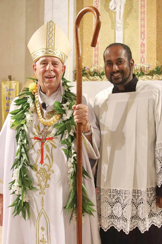 Bishop Larry Silva and Anthony Selvanathan at a confirmation Mass at the Co-Cathedral of St. Theresa in Honolulu. (Courtesy Dann Ebina)