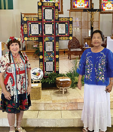 Robbi Kean, left, wore a traditional Ukrainian outfit, and Lucy Peros wore traditional Filipino attire at the send-off Mass for the diocesan traveling Jubilee cross, which left Christ the King Church in Kahului July 26 and was transported to St. Ann Church in Waihee. (Courtesy Audie Pascual)