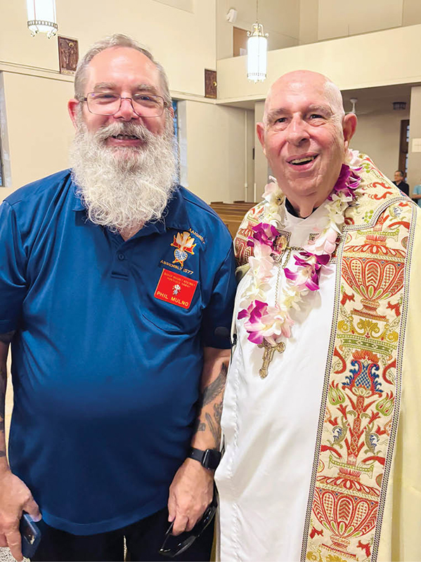 On Aug. 6, the feast day of the Transfiguration of the Lord, members of the Knights of Columbus Bishop Louis Maigret Assembly 1577 attended a holy hour for vocations at the Co-Cathedral of St. Theresa in Honolulu. Bishop Larry Silva presided at the holy hour; afterward, the congregation sang “Happy Birthday” to him on the occasion of his 76th birthday. Standing next to Bishop Silva is faithful captain Phil Mulno, who celebrated his own birthday a day after Bishop Silva. (Courtesy Mel Tom)
