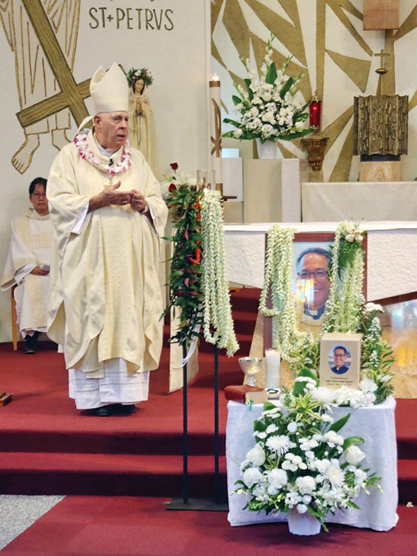 Bishop Larry Silva gave the homily during Father Khanh Pham-Nguyen’s funeral Mass Aug. 16 at Sts. Peter and Paul Church in Honolulu. (Courtesy Dann Ebina)