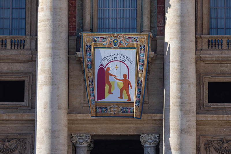 A banner for last year’s World Day of the Poor hangs from the facade of St. Peter’s Basilica in St. Peter’s Square at the Vatican. (Pablo Esparza / CNS)
