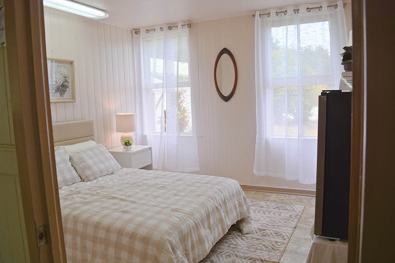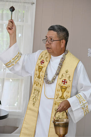 Top: A bedroom in the new kupuna housing project at Our Lady of Lourdes Church in Honokaa. Blessed in August, the rooms were furnished and decorated by parishioners. Above: Father Anselmo “Jun” Bobier, pastor of Our Lady of Lourdes, blesses the facility. (Photos by Lisa Dahm / Hawaii Catholic Herald)