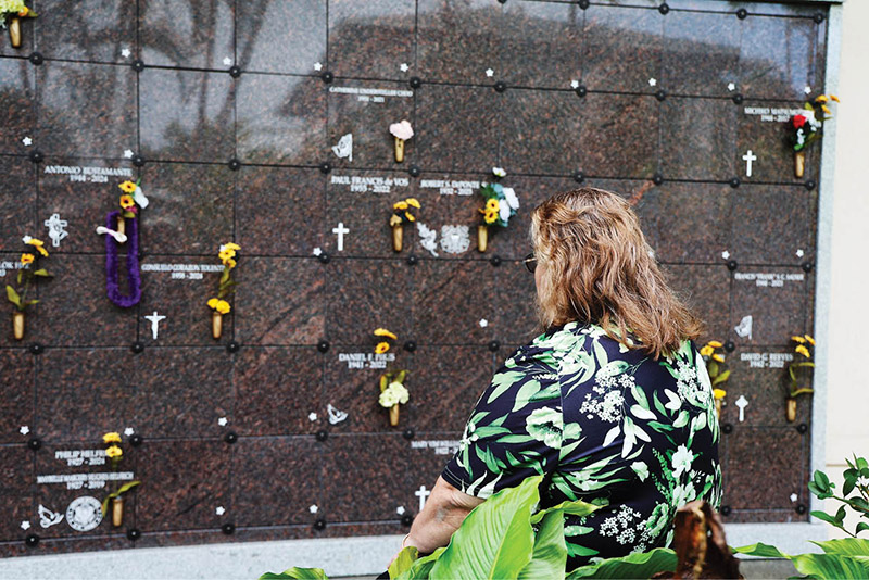 Above: Dona Clamucha, receptionist for St. Ann Church in Kaneohe, regularly visits the parish’s columbarium where her father, Daniel Pires, was inurned after he died in 2022. (Lisa Dahm / Hawaii Catholic Herald)