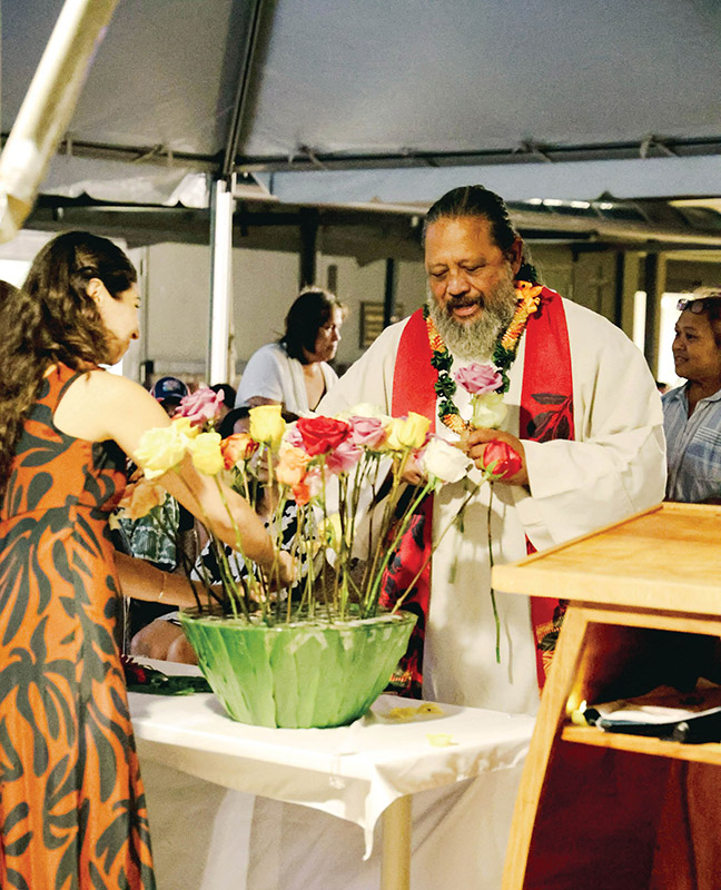 Above top: Petra and Don Ranches attended the Oct. 24 A Rose for Remembrance service at St. Francis Healthcare System of Hawaii’s St. Francis Kupuna Courtyard in Liliha. Petra Ranches, a nurse practitioner with St. Francis Hospice, said “it’s an honor” to be with patients on their end-of-life journey. Above bottom: Kahu Kaleo Patterson, vicar of St. Stephen Episcopal Church in Wahiawa and president of the Pacific Justice and Reconciliation Center, placed a rose in a bouquet in memory of a loved one Oct. 24 during St. Francis Hospice’s A Rose for Remembrance ceremony. (Photos by Lisa Dahm / Hawaii Catholic Herald)