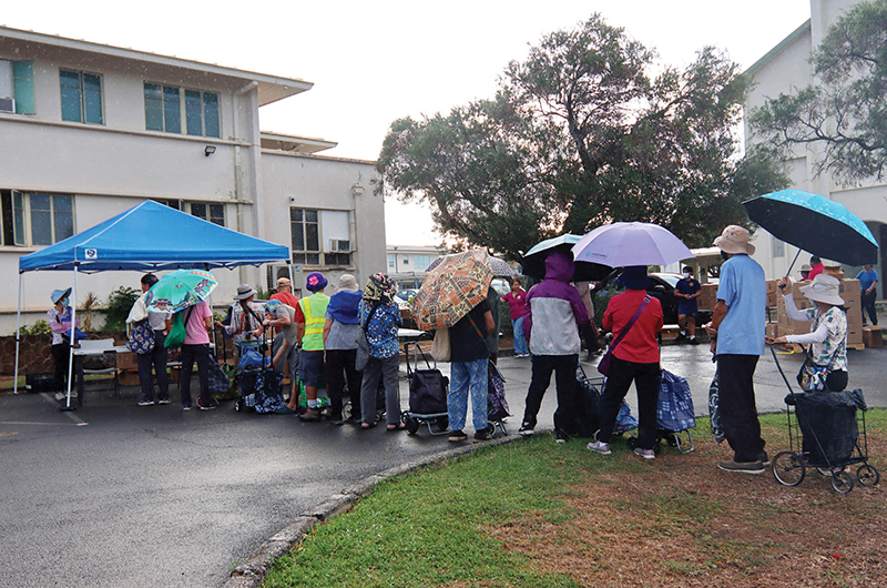 At top: Seniors braved the weather to line up early Nov. 8 to register for food box distribution at the Co-Cathedral of St. Theresa in Honolulu. (Courtesy Dann Ebina)