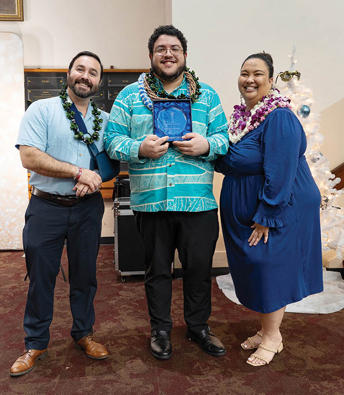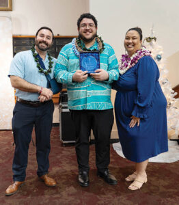 Above: Bishop Larry Silva received EPIC Ministry’s EPIC Award at the organization’s annual Christmas banquet. Alex Cook, left; Deacon Taylor K. Mitchell; and Christine Licato were the finalists for EPIC Ministry’s Young Adult of the Year award. (Courtesy Kainoa Fukumoto)