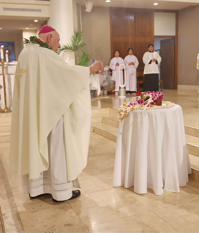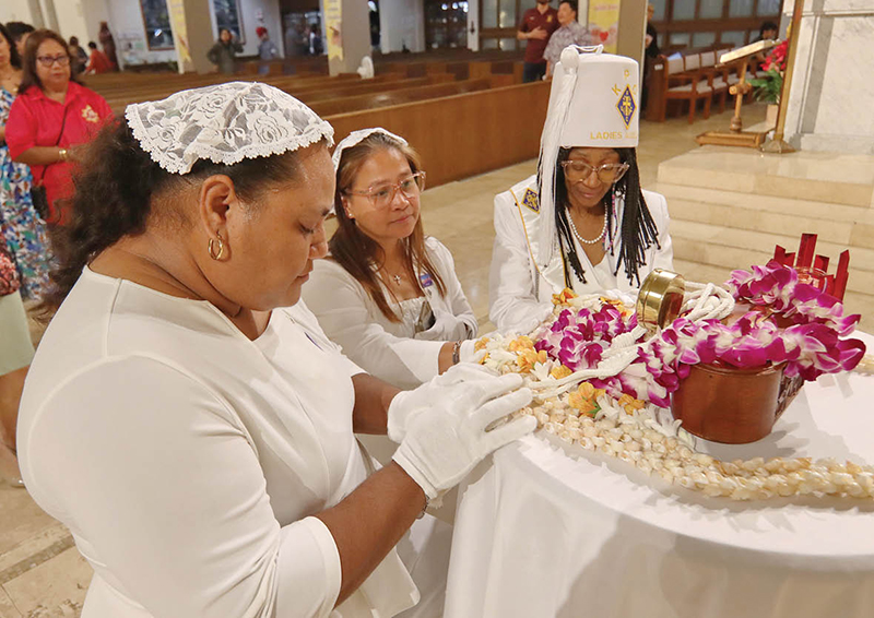 People gathered at the Co-Cathedral of St. Theresa in Honolulu Jan. 23 to mark the feast day of St. Marianne Cope with a special Mass. Bishop Larry Silva, above left, celebrated the Mass and blessed the first-class relic of St. Marianne, which was displayed for veneration. The Diocese of Honolulu and the Sisters of St. Francis of the Neumann Communities — St. Marianne was a Sister of St. Francis — coordinated the liturgy. Members of the Ladies Auxiliary of the Knights of Peter Claver, above right, were among those who venerated the relic. (Photos courtesy Dann Ebina)